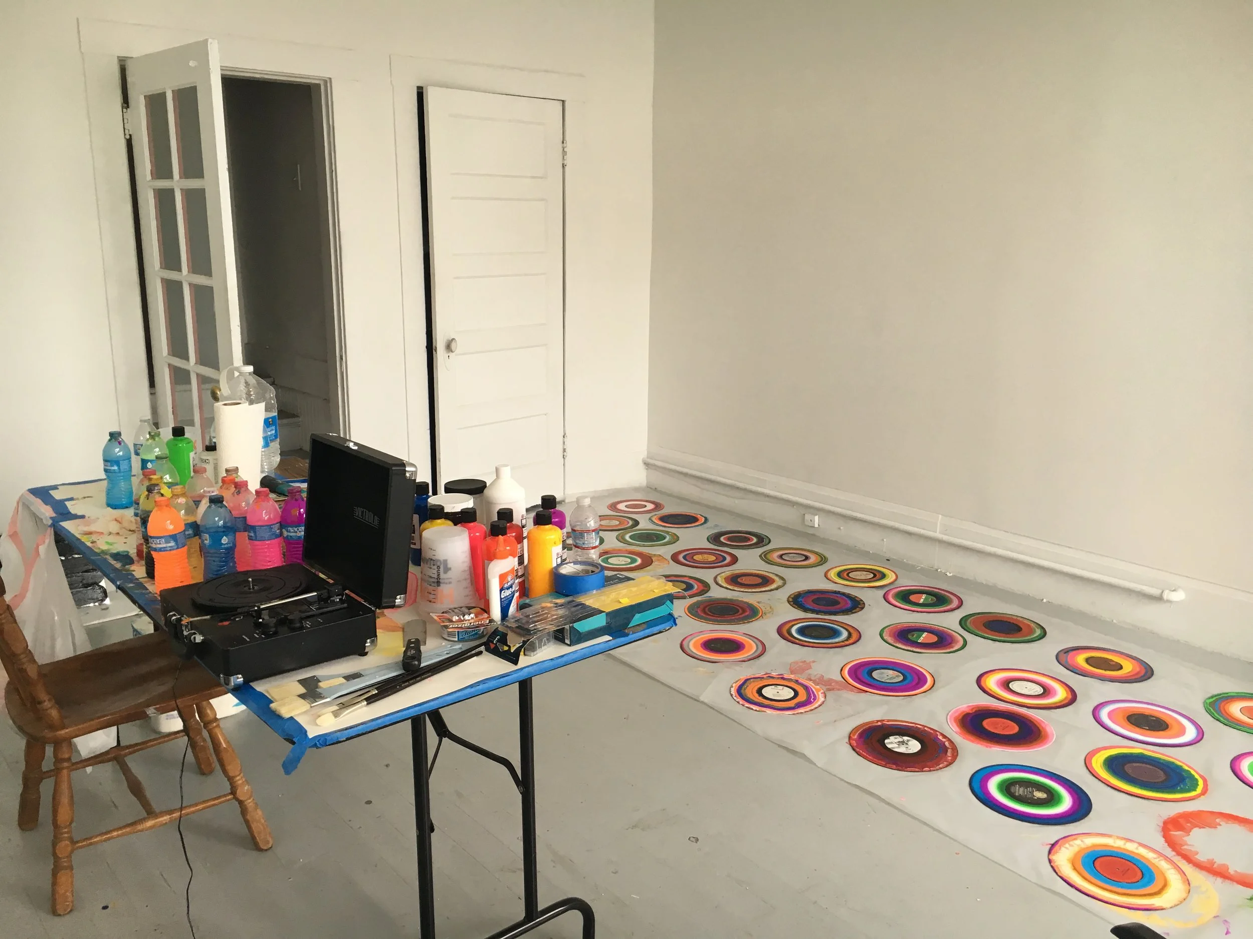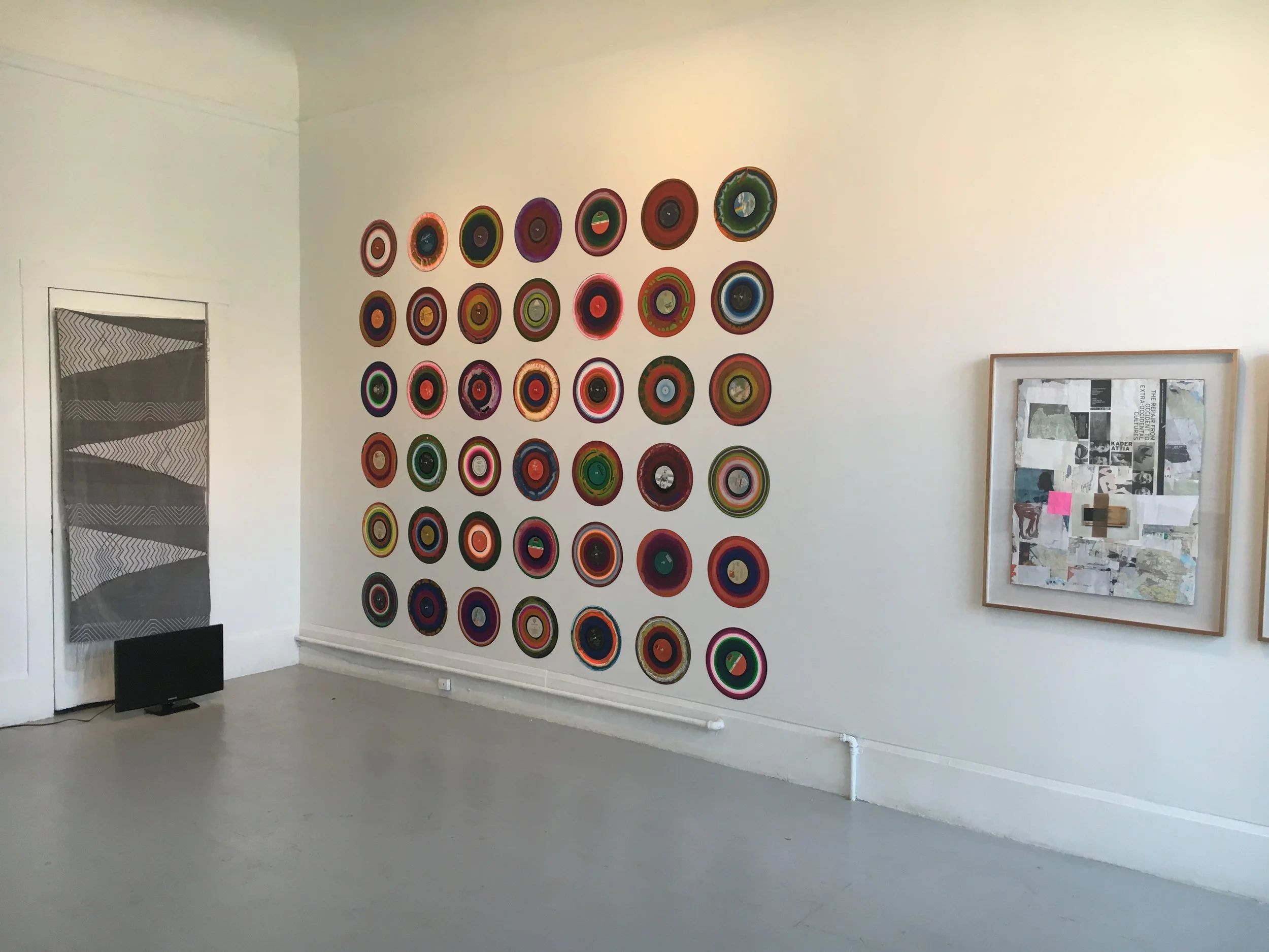 Tan also presents a series of what he terms as spin paintings, produced by makeshift players and paint on vinyl records. The machines are refashioned so that their needles spread and push acrylic paint across the records’ grooves, creating spirals and patterns of pigment. This series can be compared to an earlier work by the artist, titled Skateboard Painting (2015), where the artist wields the skateboard as brush to produce a diptych marked by intersecting linear forms. As a counterpoint or bookend to the Hablon Redux Project, where sound is eventually distilled into visual objects, the spin paintings highlight the gesture of inscribing on objects formerly serving as functional distillations of sound. Encountered in relation to the other, the works underscore the reflexive binary between sound as painting and painting as sound.